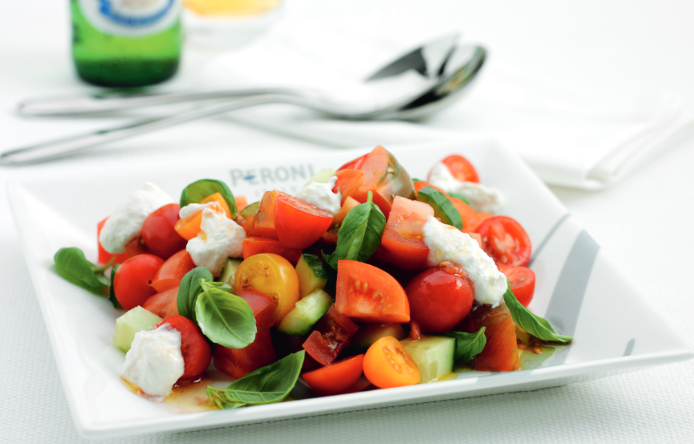 浅いボウルにトマトと角切りにしたきゅうりを入れ、バジルの葉をちぎって散らします。ホイップしたブッラータを加え、その上からドレッシングをかけます。