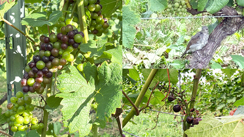 写真3. アライグマによる食害。人間が食べるとまだ酸っぱくて渋いピノ・ノワールですが、アライグマは器用に食べていきました。