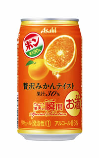 『アサヒチューハイ果実の瞬間 贅沢みかんテイスト』は、果汁100%ジュースのロングセラーブランドである「ポンジュース」でおなじみの(株)えひめ飲料の“ポン果汁(*)”を30%使用した、果汁感たっぷりの味わいが楽しめるみかんテイストの缶入りチューハイです。